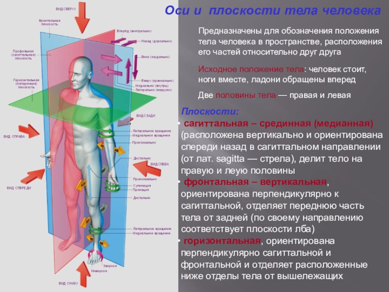 сагиттальная – срединная (медианная) (расположена вертикально и ориентирована спереди назад в сагиттальном направлении (от лат. sagitta — стрела), делит тело на правую и леую половины