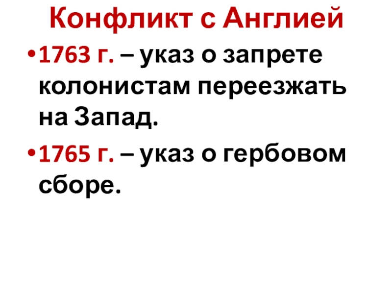 Конфликт с Англией1763 г. – указ о запрете колонистам переезжать на Запад. 1765 г. – указ о