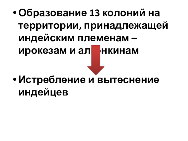 Образование 13 колоний на территории, принадлежащей индейским племенам – ирокезам и алгонкинамИстребление и вытеснение индейцев