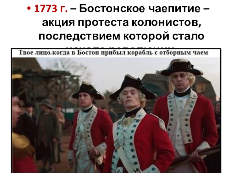 1773 г. – Бостонское чаепитие – акция протеста колонистов, последствием которой стало начало революции. ,