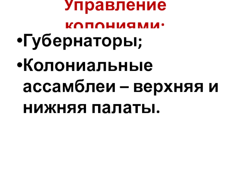 Управление колониями:Губернаторы;Колониальные ассамблеи – верхняя и нижняя палаты.