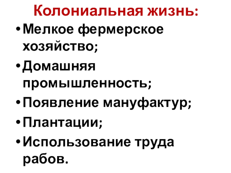Колониальная жизнь:Мелкое фермерское хозяйство;Домашняя промышленность;Появление мануфактур;Плантации;Использование труда рабов.