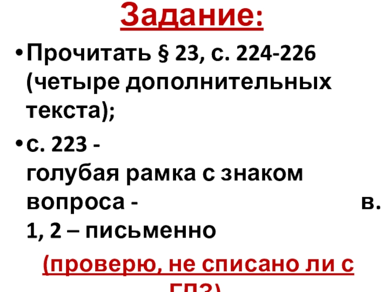 Задание:Прочитать § 23, с. 224-226 (четыре дополнительных текста);с. 223 -