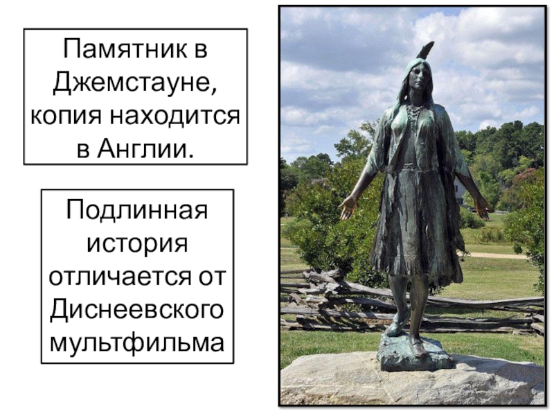 Памятник в Джемстауне, копия находится в Англии. Подлинная история отличается от Диснеевского мультфильма