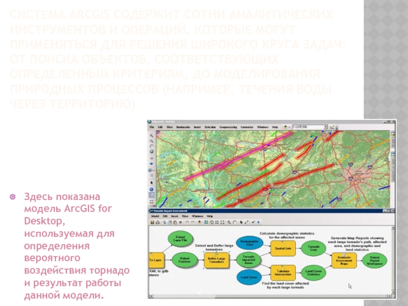 Здесь показана модель ArcGIS for Desktop, используемая для определения вероятного воздействия торнадо и результат работы данной модели.