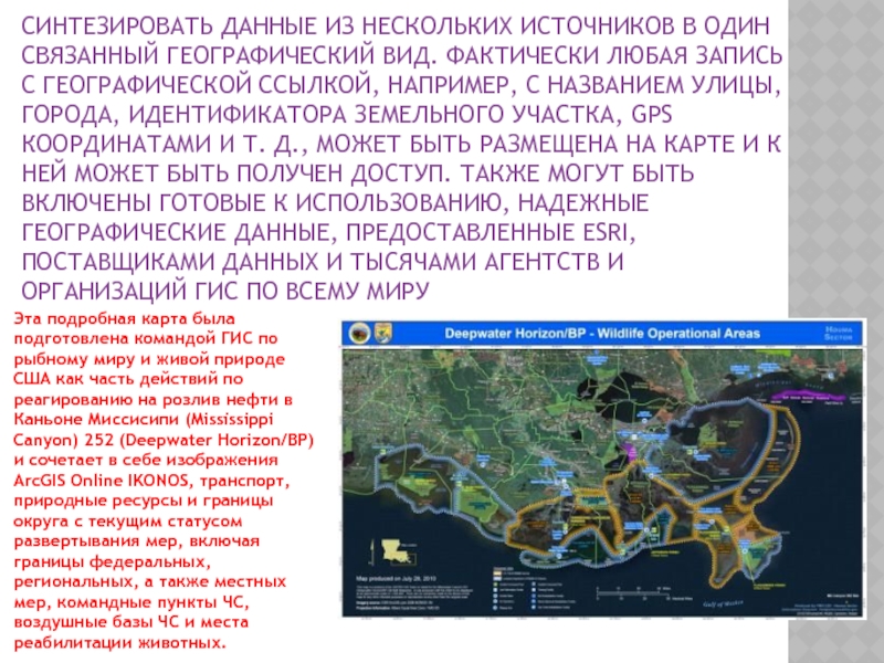 Эта подробная карта была подготовлена командой ГИС по рыбному миру и живой природе США как часть действий по реагированию на розлив нефти в Каньоне Миссисипи (Mississippi Canyon) 252 (Deepwater Horizon/BP) и сочетает в себе изображения ArcGIS Online IKONOS, транспорт, природные ресурсы и границы округа с текущим статусом развертывания мер, включая границы федеральных, региональных, а также местных мер, командные пункты ЧС, воздушные базы ЧС и места реабилитации животных.