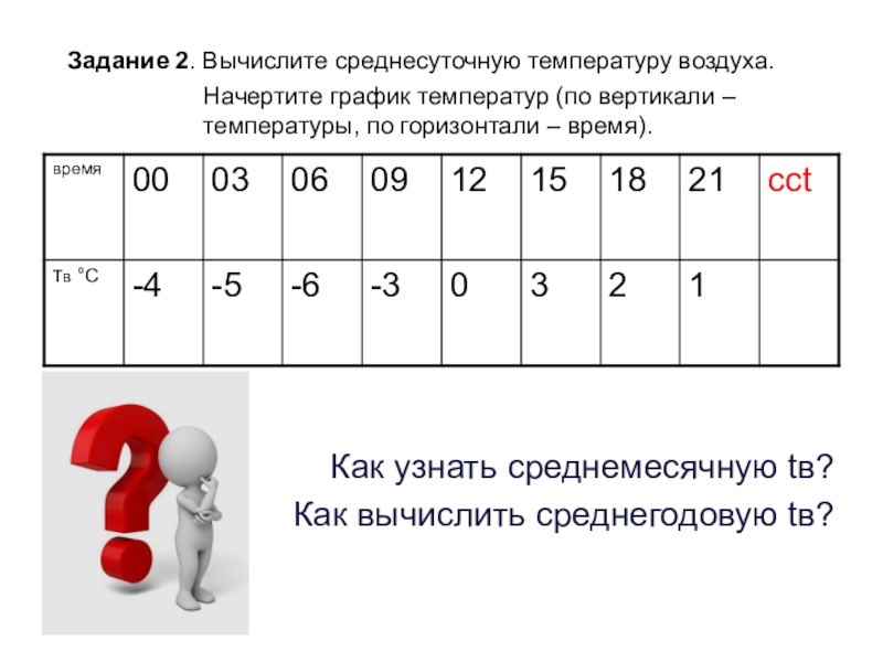 Слайд 21 Задание 2. Вычислите среднесуточную температуру воздуха.