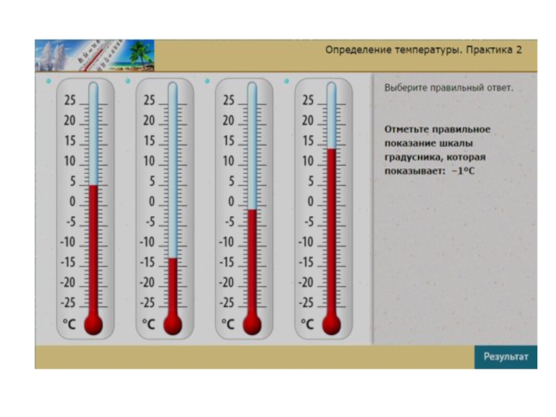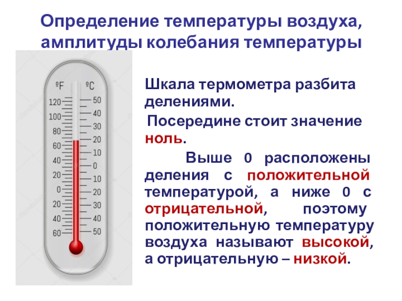 Выше 0 расположены деления с положительной температурой, а ниже 0 с отрицательной, поэтому положительную температуру воздуха называют высокой, а отрицательную – низкой.