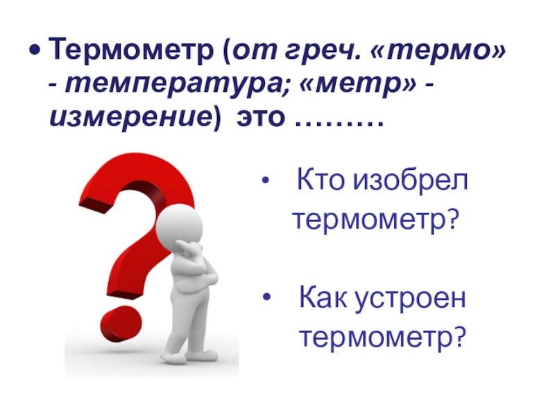 Слайд 2Термометр (от греч. «термо» - температура; «метр» - измерение) это