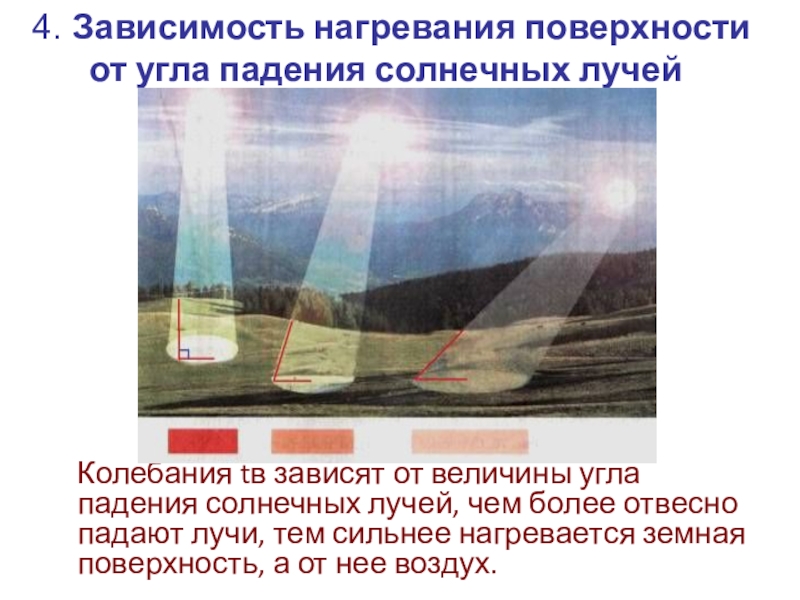 солнечных лучей, чем более отвесно падают лучи, тем сильнее нагревается земная поверхность, а от нее воздух.