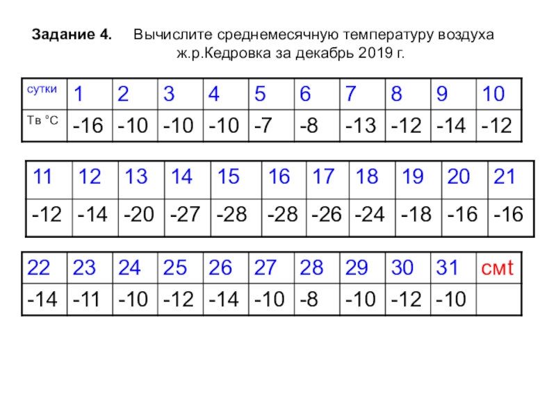 Слайд 24Задание 4. Вычислите среднемесячную температуру воздуха