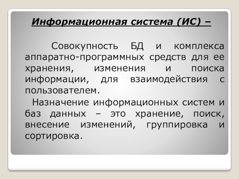 Назначение информационных систем и баз данных – это хранение, поиск, внесение изменений, группировка и сортировка.