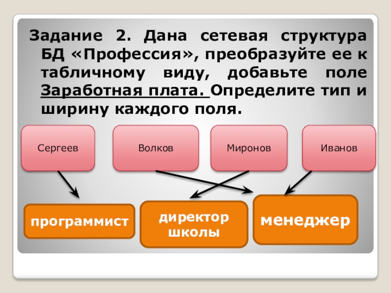 Слайд 11Задание 2. Дана сетевая структура БД «Профессия», преобразуйте ее к