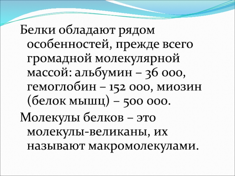 Белки обладают рядом особенностей, прежде всего громадной молекулярной массой: альбумин – 36 000, гемоглобин – 152 000, миозин (белок