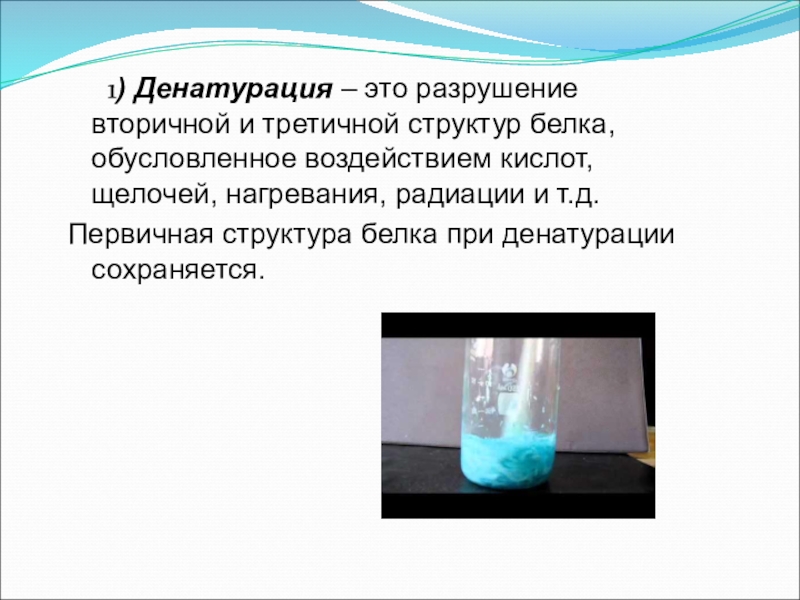 1) Денатурация – это разрушение вторичной и третичной структур белка, обусловленное воздействием кислот, щелочей, нагревания, радиации и