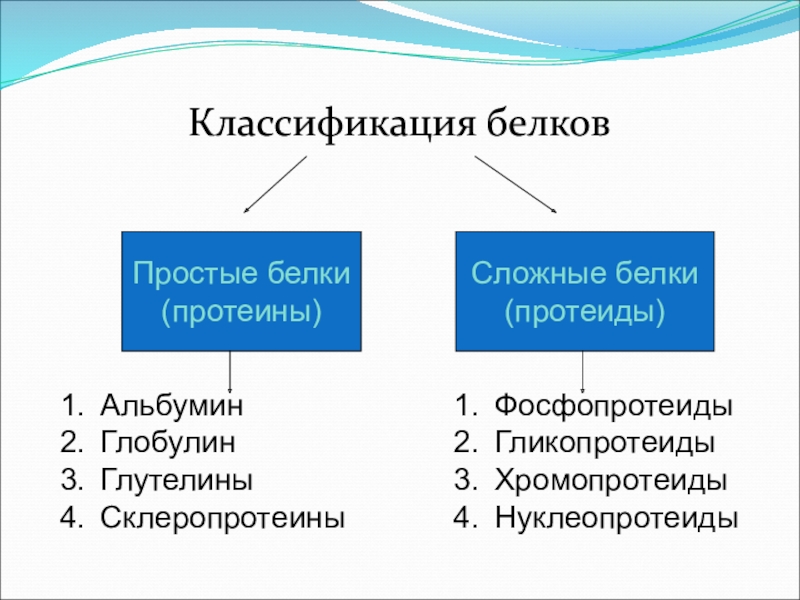 Классификация белковПростые белки(протеины)Сложные белки(протеиды)АльбуминГлобулинГлутелиныСклеропротеиныФосфопротеидыГликопротеидыХромопротеидыНуклеопротеиды