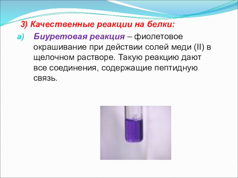 3) Качественные реакции на белки:Биуретовая реакция – фиолетовое окрашивание при действии солей меди (II) в щелочном растворе.