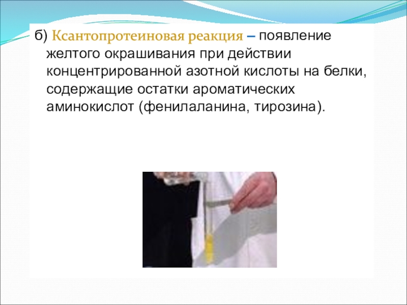 Слайд 14б) Ксантопротеиновая реакция – появление желтого окрашивания при действии концентрированной