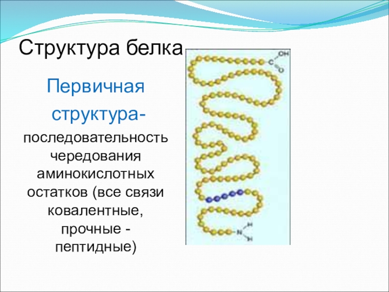 Структура белкаПервичная структура-последовательность чередования аминокислотных остатков (все связи ковалентные, прочные - пептидные)