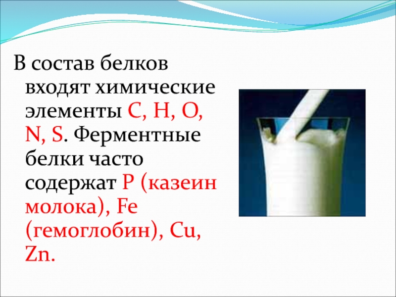 В состав белков входят химические элементы C, H, O, N, S. Ферментные белки часто содержат P (казеин