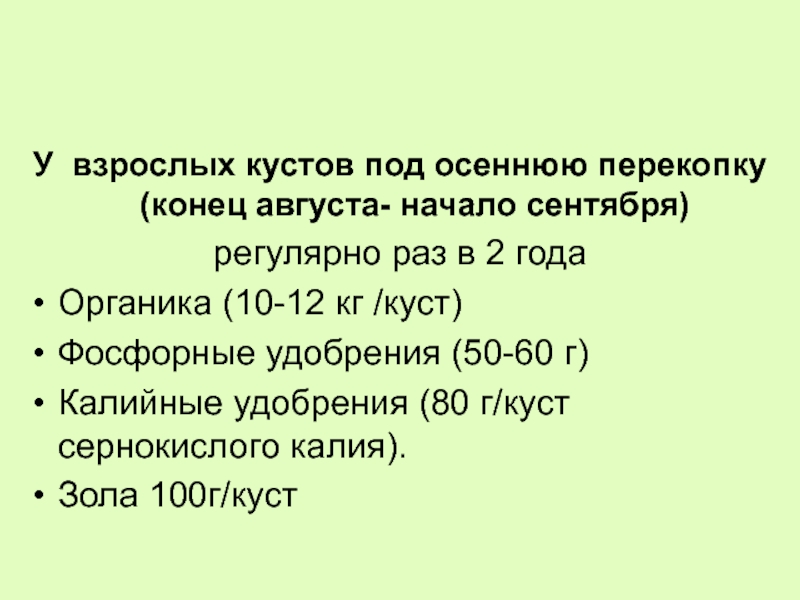 Слайд 27У взрослых кустов под осеннюю перекопку (конец августа- начало сентября)