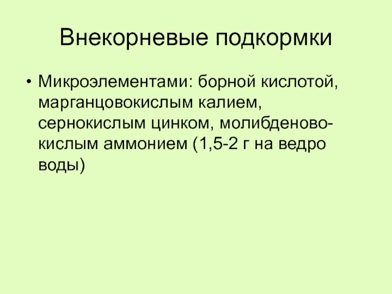 Микроэлементами: борной кислотой, марганцовокислым калием, сернокислым цинком, молибденово-кислым аммонием