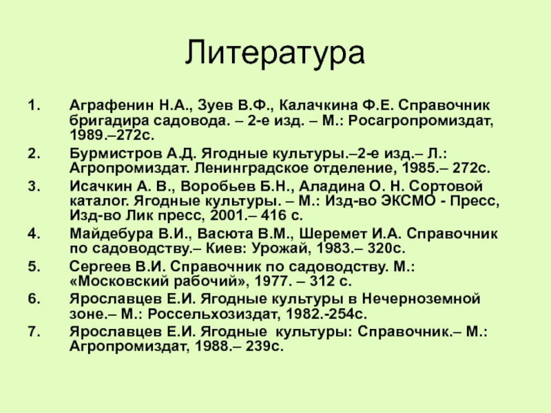 Ярославцев Е.И. Ягодные культуры: Справочник.– М.: Агропромиздат, 1988.– 239с.