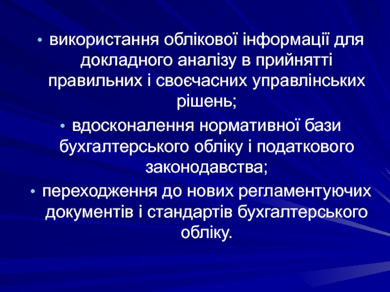 використання облікової інформації для докладного аналізу в прийнятті правильних і своєчасних управлінських рішень;вдосконалення нормативної бази бухгалтерського обліку