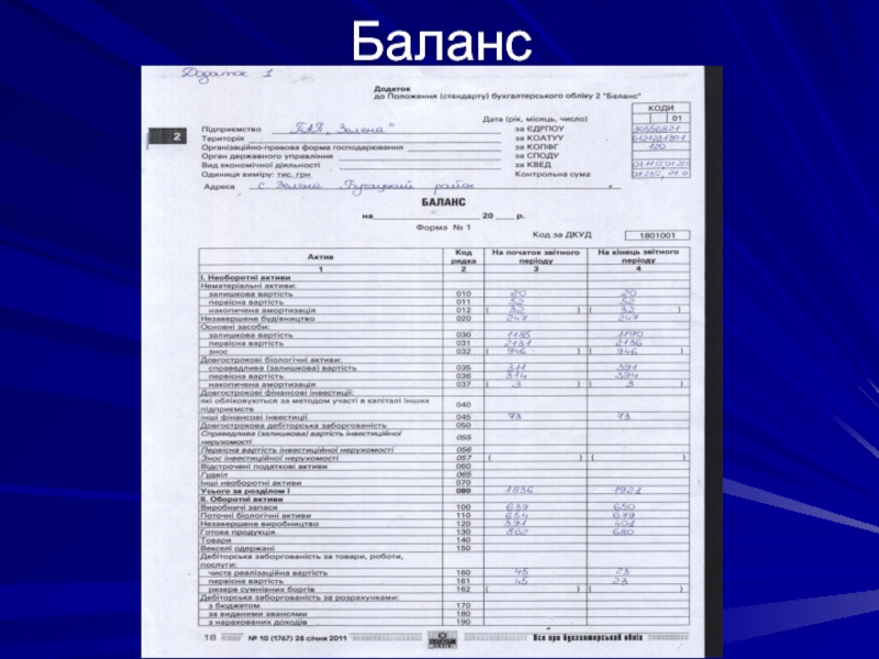 Слайд 6Баланс – звіт про фінансовий стан підприємства,який відображає на певну