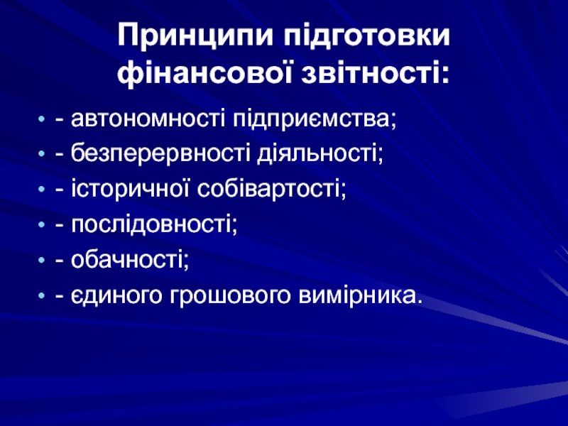 Принципи підготовки фінансової звітності: - автономності підприємства;- безперервності діяльності;- історичної собівартості;- послідовності;- обачності;- єдиного грошового вимірника.