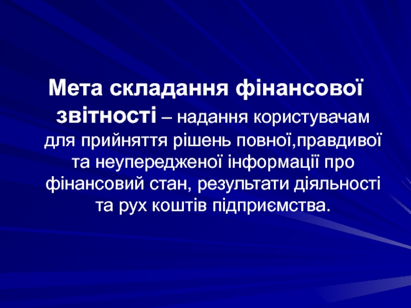 Мета складання фінансової звітності – надання користувачам для прийняття рішень повної,правдивої та неупередженої інформації про фінансовий стан,