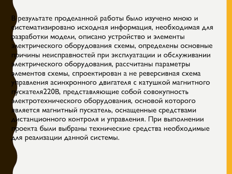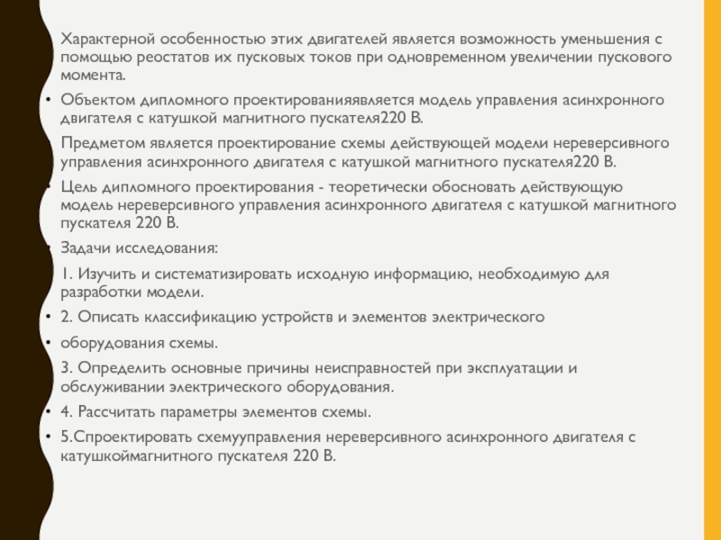 Цель дипломного проектирования - теоретически обосновать действующую модель нереверсивного управления асинхронного двигателя с катушкой магнитного пускателя 220 В.