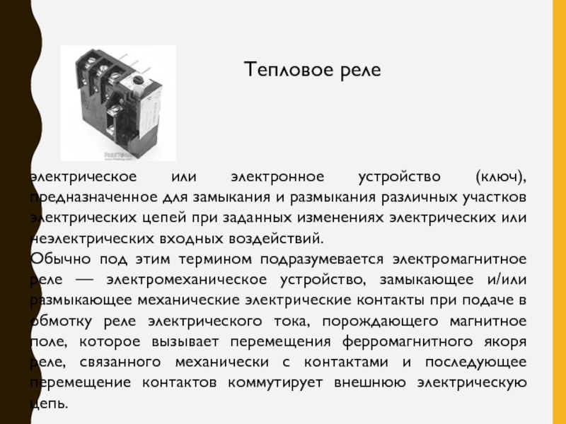 Обычно под этим термином подразумевается электромагнитное реле — электромеханическое устройство, замыкающее и/или размыкающее механические электрические контакты при подаче в обмотку реле электрического тока, порождающего магнитное поле, которое вызывает перемещения ферромагнитного якоря реле, связанного механически с контактами и последующее перемещение контактов коммутирует внешнюю электрическую цепь.