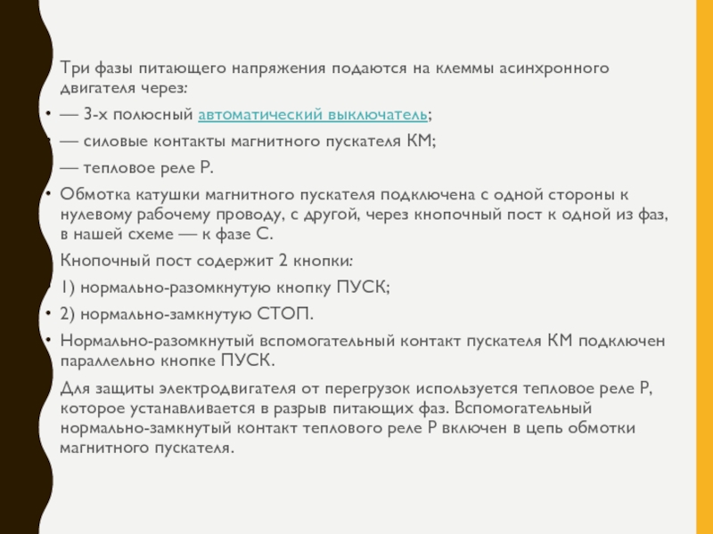 Для защиты электродвигателя от перегрузок используется тепловое реле Р, которое устанавливается в разрыв питающих фаз. Вспомогательный нормально-замкнутый контакт теплового реле Р включен в цепь обмотки магнитного пускателя.