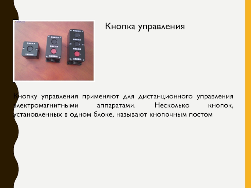 Кнопку управления применяют для дистанционного управления электромагнитными аппаратами. Несколько