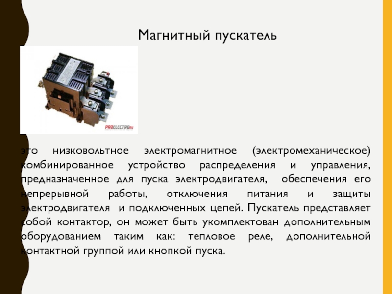 и защиты электродвигателя и подключенных цепей. Пускатель представляет собой контактор, он может быть укомплектован дополнительным оборудованием таким как: тепловое реле, дополнительной контактной группой или кнопкой пуска.
