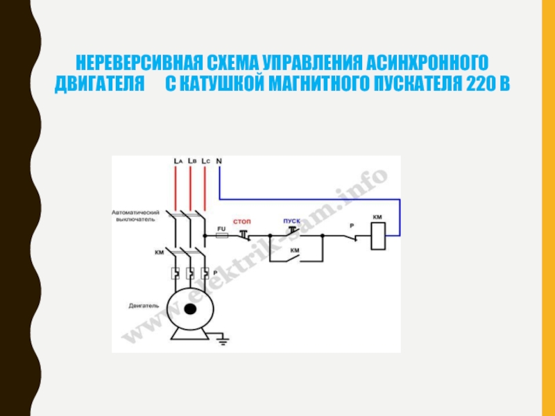 Слайд 6Нереверсивная схема управления асинхронного двигателя с катушкой магнитного