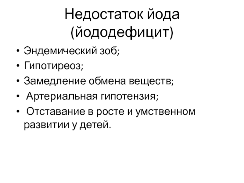 Недостаток йода (йододефицит)Эндемический зоб;Гипотиреоз;Замедление обмена веществ; Артериальная гипотензия; Отставание в росте и умственном развитии у детей.