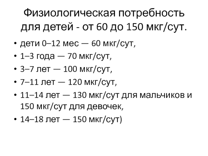 Слайд 8Физиологическая потребность для детей - от 60 до 150 мкг/сут.