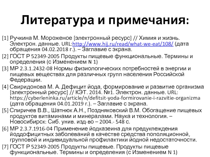 Литература и примечания:  [1] Ручкина М. Мороженое [электронный ресурс] // Химия и жизнь. Электрон. данные. URL:http://www.hij.ru/read/what-we-eat/108/ (дата