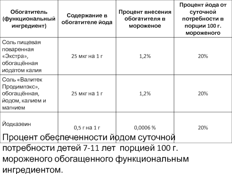 Процент обеспеченности йодом суточной потребности детей 7-11 лет порцией 100 г. мороженого обогащенного функциональным ингредиентом.