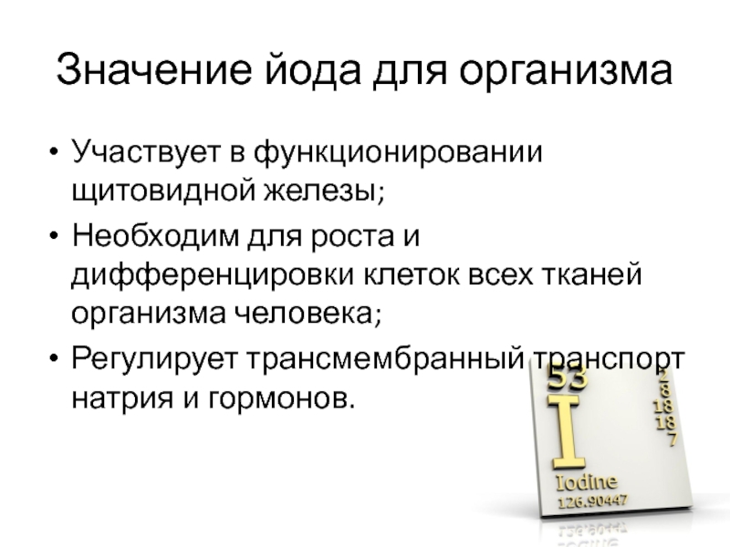 Значение йода для организмаУчаствует в функционировании щитовидной железы;Необходим для роста и дифференцировки клеток всех тканей организма человека;Регулирует