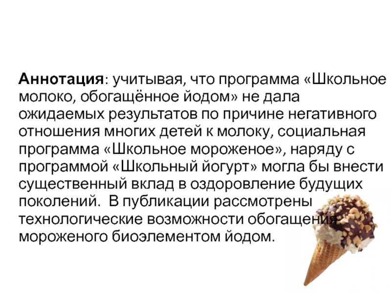 Аннотация: учитывая, что программа «Школьное молоко, обогащённое йодом» не дала ожидаемых результатов по причине негативного отношения многих детей к молоку, социальная программа «Школьное мороженое», наряду с программой «Школьный йогурт»