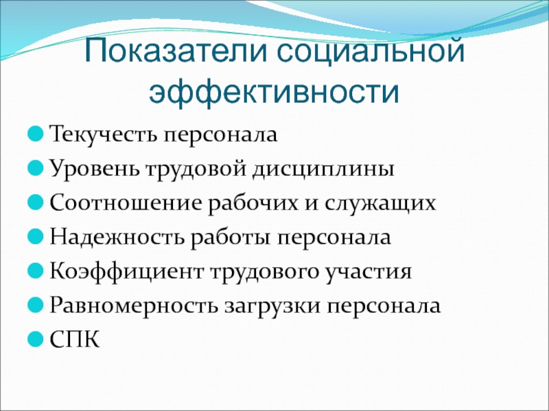 Показатели социальной эффективностиТекучесть персоналаУровень трудовой дисциплиныСоотношение рабочих и служащихНадежность работы персоналаКоэффициент трудового участияРавномерность загрузки персоналаСПК