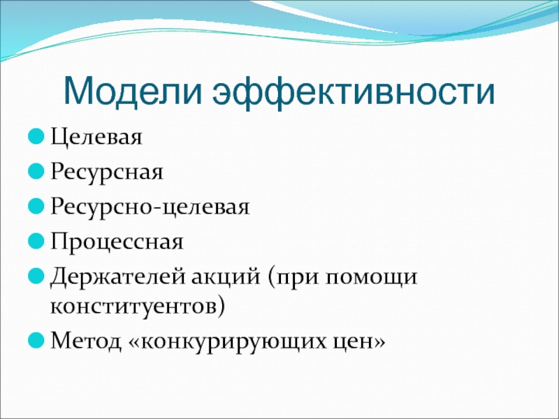 Модели эффективностиЦелеваяРесурснаяРесурсно-целеваяПроцесснаяДержателей акций (при помощи конституентов)Метод «конкурирующих цен»