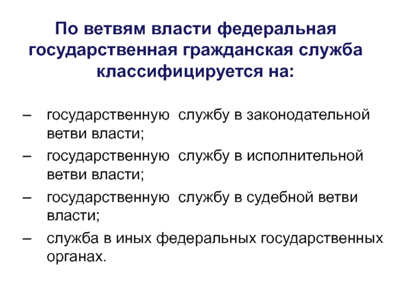 Слайд 8По ветвям власти федеральная государственная гражданская служба классифицируется на: