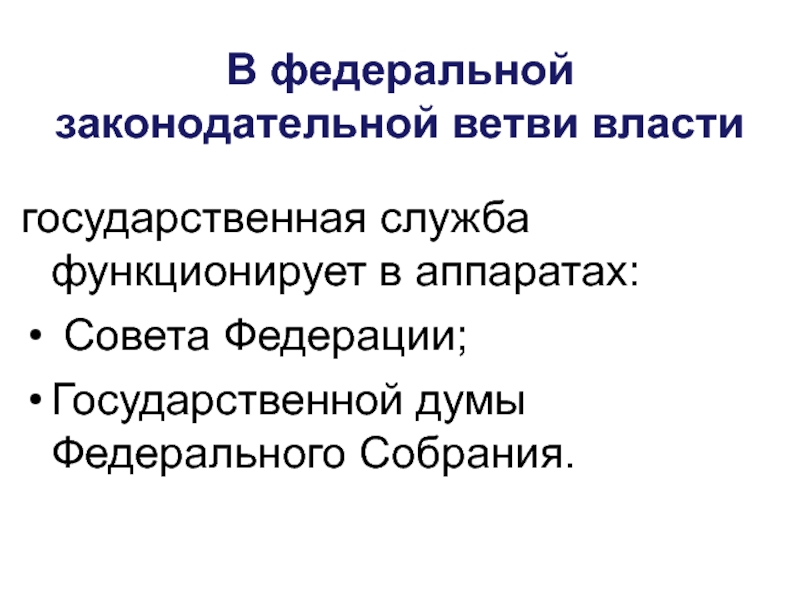 Слайд 12Федеральная госслужба в иных органах государственной власти существует в аппаратах: