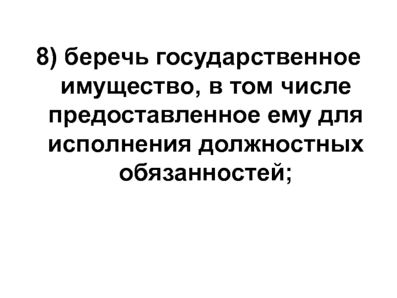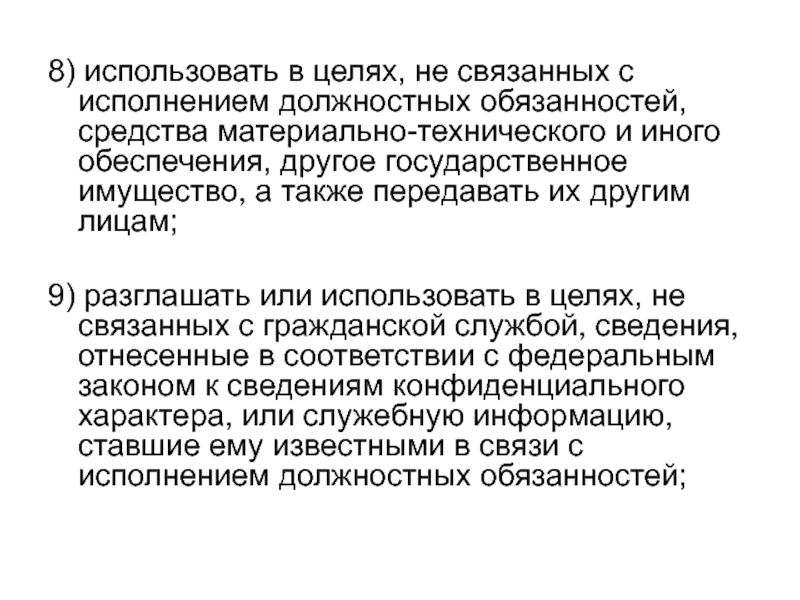 Слайд 788) использовать в целях, не связанных с исполнением должностных обязанностей,