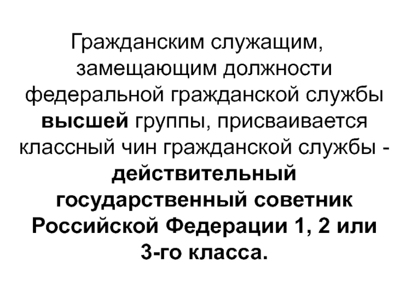 Слайд 24Гражданским служащим, замещающим должности федеральной гражданской службы высшей группы, присваивается