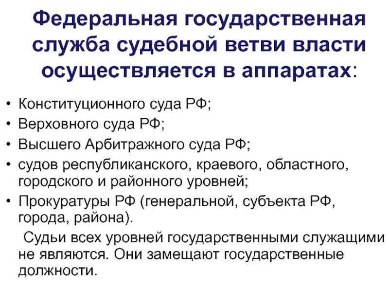 Слайд 11Федеральная государственная служба судебной ветви власти осуществляется в аппаратах: